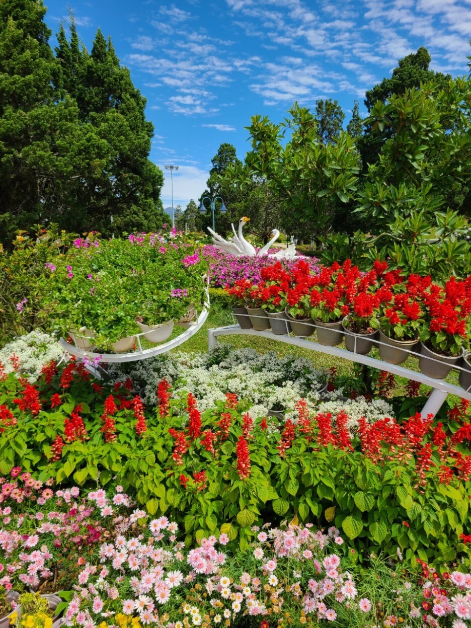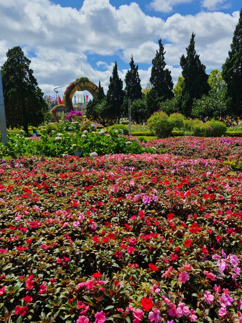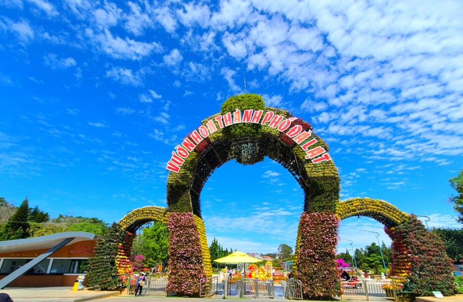 아내의 손을 잡고 30여 분을 걸어가니 온통 꽃으로 장식한 달랏 꽃정원(Dalat Flower Garden) 정문이 파란 하늘에 수를 놓듯 나타났다. 어쩌면 저렇게 하늘이 파랄까? 미세먼지 한 점 없는 파란 하늘에 흰 구름이 점점이 아름답게 수를 놓고 있다. 쑤언흐엉호수 북쪽 끝에 있는 달랏 꽃정원은 약 7천㎥에 달한다. 입장료 70,000동을 내고 안으로 들어가니 그야말로 꽃들의 천국이다.