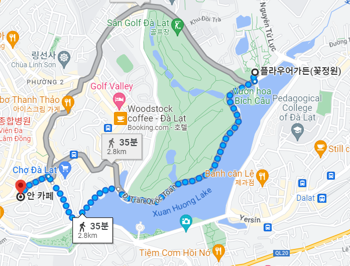 안카페에서 달랏 꽃정원까지 걸어서 갔다. 달랏 중심가에 있는 쑤언흐엉 호수는 호수둘레가 약 5km로 걷기에 아주 좋다